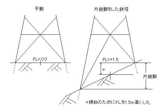 ○主脚継(ポスト継) 鉄塔が傾斜地に建てられる場合、床板上の土量が少なくなり、基礎の引揚耐力(基礎を引っ張りあげようとする力に耐える力)が不足する場合がある。この様な場合には、片継脚とは別に、基礎コンクリート柱体部のみ長さを標準より伸ばし、基礎の根入れ(基礎の深さ)を深くして、基礎耐力を確保する。この場合、鉄塔の主柱材のみを必要な寸法だけ長く継ぎ足すため主脚継(ポスト継)という。 |